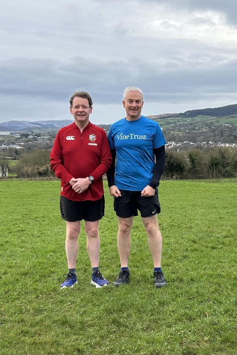 Stewart is running in memory of his wife, Julia, a member of the Vine Trust board and a much-loved and admired volunteer. Julia had worked aboard the Jubilee Hope medical ship three times and had planned two further trips in 2025 prior to her death in May 2024. The photograph shows Stewart about to go on a training run with Julia’s brother, Keith Hamilton whilst on a visit to Northern Ireland.